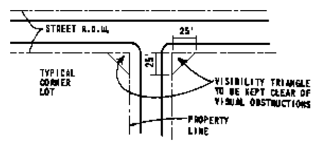 Street Intersection Visibility Triangles. No sign shall be located or placed where it obstructs the vision of motor vehicle drivers approaching any street intersection. At all street intersections, clear vision shall be maintained across the lot for a distance of twenty-five (25') feet back from the property corner along both streets. Within this triangle, vision shall be clear at elevations between thirty inches (30") and nine feet (9') above the average curb grade.