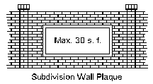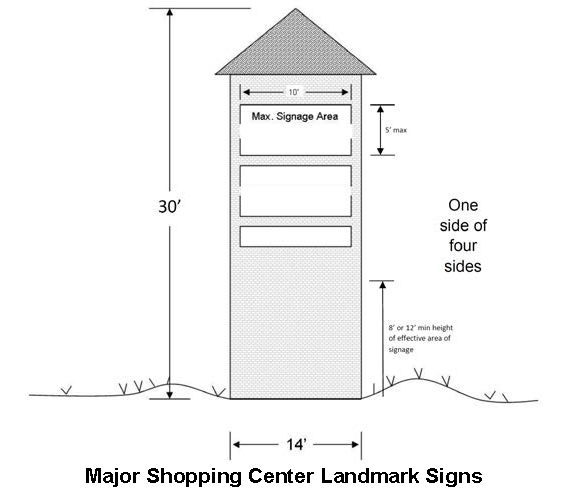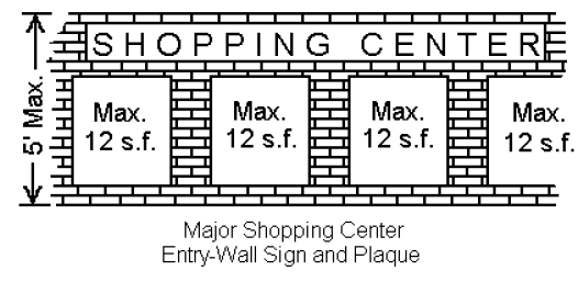 Major Shopping Center Entry-Wall Signs and Plaques: The purpose of a major shopping center entry-wall sign and plaque is to identify a major shopping center and the name of a business, profession, service, product or activity conducted, sold or offered within the major shopping center. Two sign structures shall be allowed per vehicular entrance and may be illuminated. The maximum height of the entry-wall structure shall not exceed five (5) feet. The maximum area of a sign plaque shall not exceed twelve (12) square feet. There shall be a minimum of three (3) feet spacing between sign plaques.
