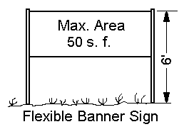Flexible Banner Signs: Banners shall be kept in good repair and remain firmly anchored or secured to the face of the building or may be suspended below the apparent lower edge of an overhanging covered walkway, provided the banner is firmly secured to the columns supporting the building. A flexible banner sign may not be freestanding. A flexible banner sign shall not exceed fifty (50) square feet nor exceed six (6) feet in height.
