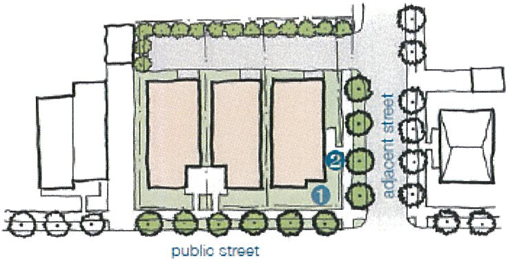 Provide space for entry, front landing, and transitional landscaping (lush, drought resistant landscaping) between the public sidewalk and private entryway.