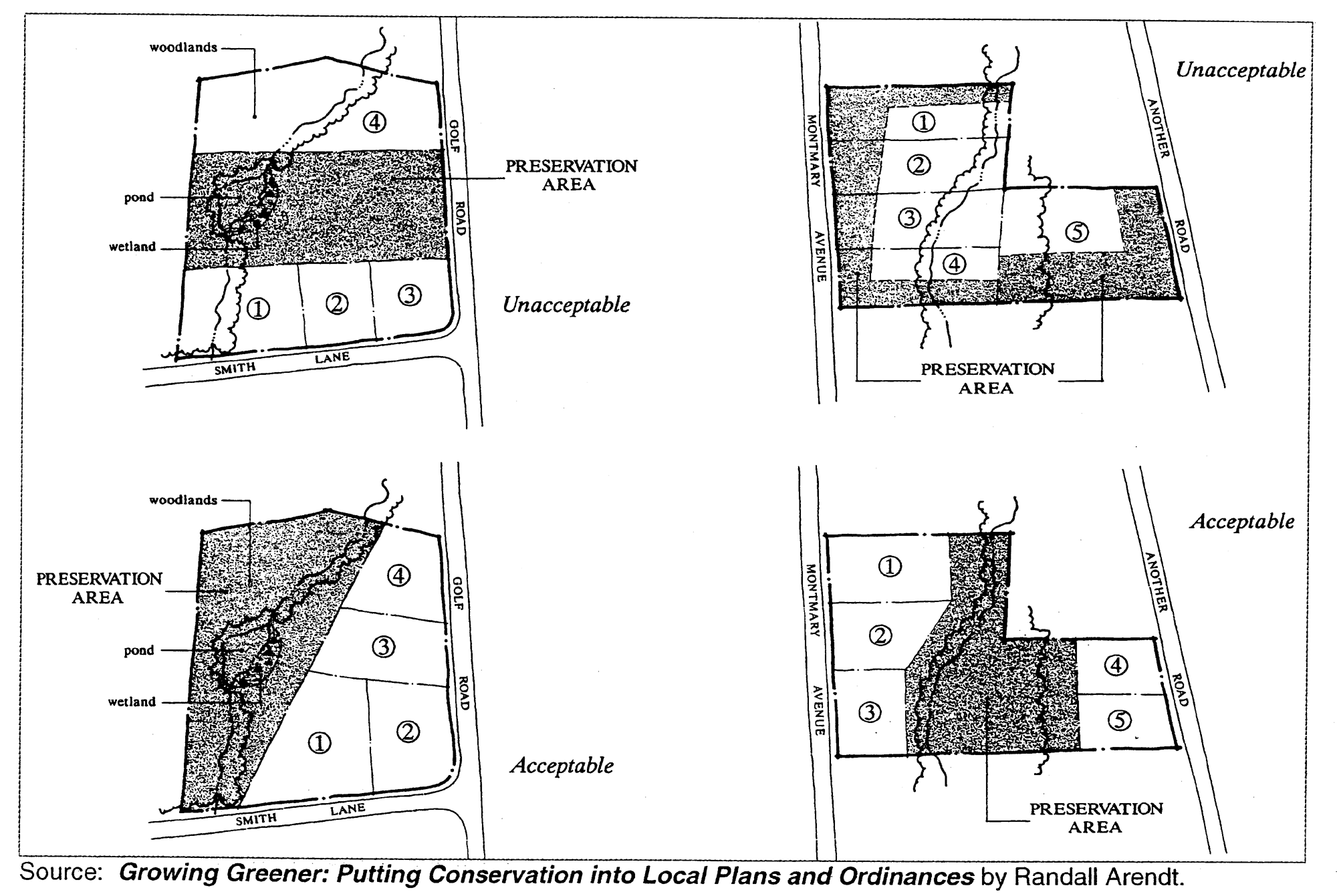 Areas Included. Open space areas must include all Primary Conservation Areas and those Secondary Conservation Areas set aside to qualify for "bonus" lots. Illustrated below are acceptable and unacceptable approaches to protection of important conservation resources.