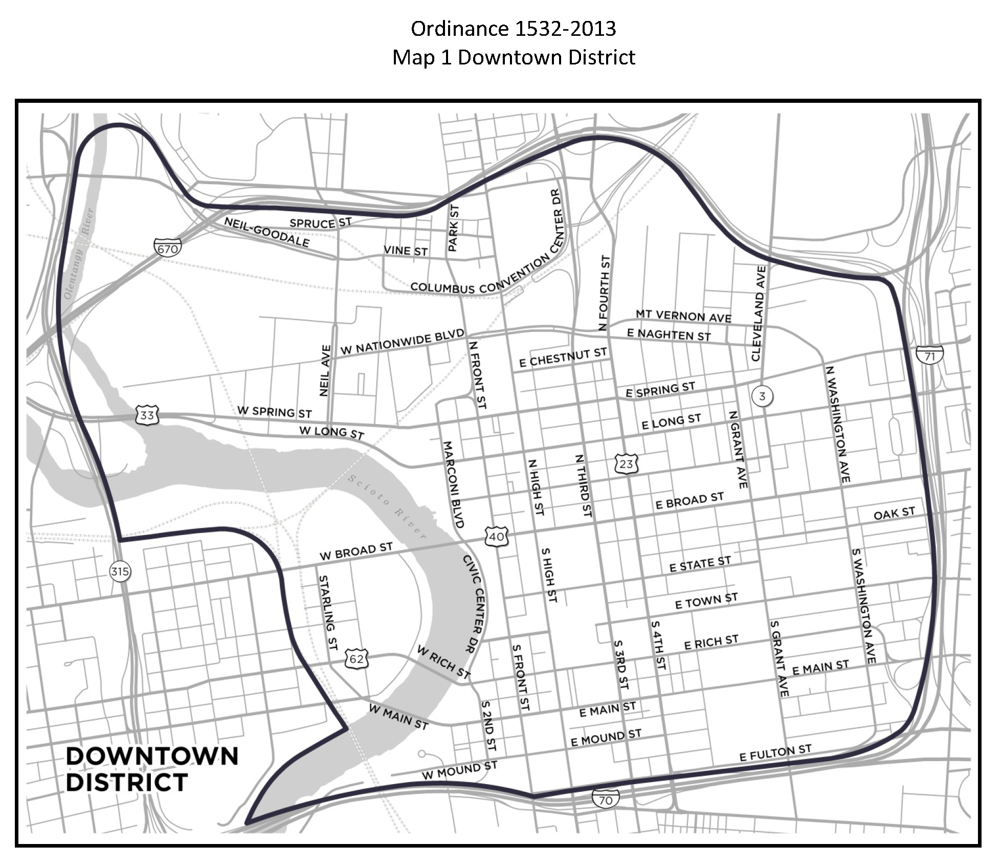 Beginning at the intersection of Interstate 70 and the western bank of the Scioto River; Thence northeasterly along the north/west bank of the Scioto River to the first railroad right-of-way; Thence northerly along said railroad right-of-way to the first intersecting railroad right-of-way; Thence westerly along said railroad right-of-way to the intersection of State Route 315; Thence northerly along State Route 315 to the northbound exit ramp to Goodale Boulevard; Thence following the exit ramp to the northernmost point of its arc; Thence easterly approximately 300' to the southbound ramp from State Route 315 to Interstate 670; Thence southeasterly along the ramp to Interstate 670; Thence easterly along Interstate 670 to the intersection of Interstate 71; Thence southerly along Interstate 71 to the intersection of Interstate 70; Thence westerly along Interstate 70 to the place of beginning.