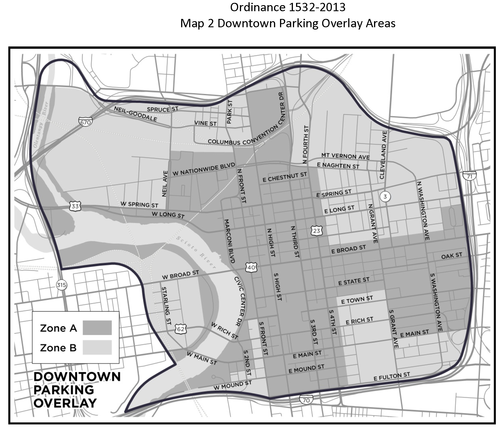 Affected Areas: The provisions of the parking overlay shall apply to parking facilities within parking zones as indicated on the official city zoning map and as illustrated on Map 2 (Downtown Parking Overlay Areas).
