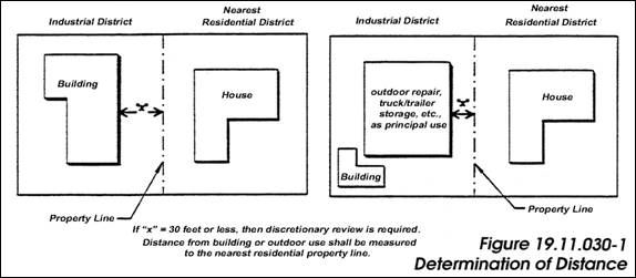 The location of a proposed manufacturing or industrial use relative to residentially-zoned property shall represent the sole factor for determining whether discretionary review is required pursuant to this section. If any building housing the principal proposed use in an manufacturing district, or any outdoor activity which represents the principal use of the property, is located three hundred feet or less from the nearest residential district (see Figure 19.11.030-1), then conditional use permit review shall be required, as indicated in Table 19.11.030A.