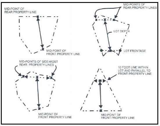 When the rear property line is formed by two or more lines, the measurement shall be from the mid-point of a line formed by connecting the mid-points of the side-most rear property lines to the front property line.