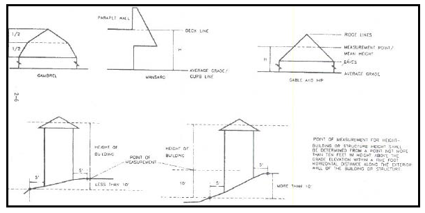 Standard Methods of Measurement. Building height is the vertical distance between the point of measurement on the ground to the highest point of (1) coping of a flat roof; or (2) to the deck line of a mansard roof; or (3) to the average height of the highest gable of a pitched or hip roof. The point of measurement may be taken from the highest adjoining sidewalk or ground surface within a five-foot horizontal distance along the exterior wall of the building, when such sidewalk or ground surface is not more than ten feet above grade.