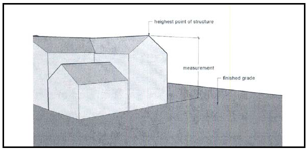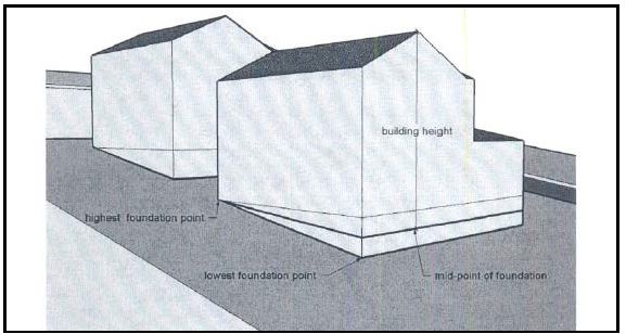 Sloped Sites. For sloped lots or buildings with varied floor elevations, the height of a building is measured as the vertical distance from the average level of the ground under the building to the allowed number of feet above and parallel to the finish grade. The average level of ground is determined by adding the elevations of the highest and lowest foundation points of the building and dividing by two (the mid-point of foundation).