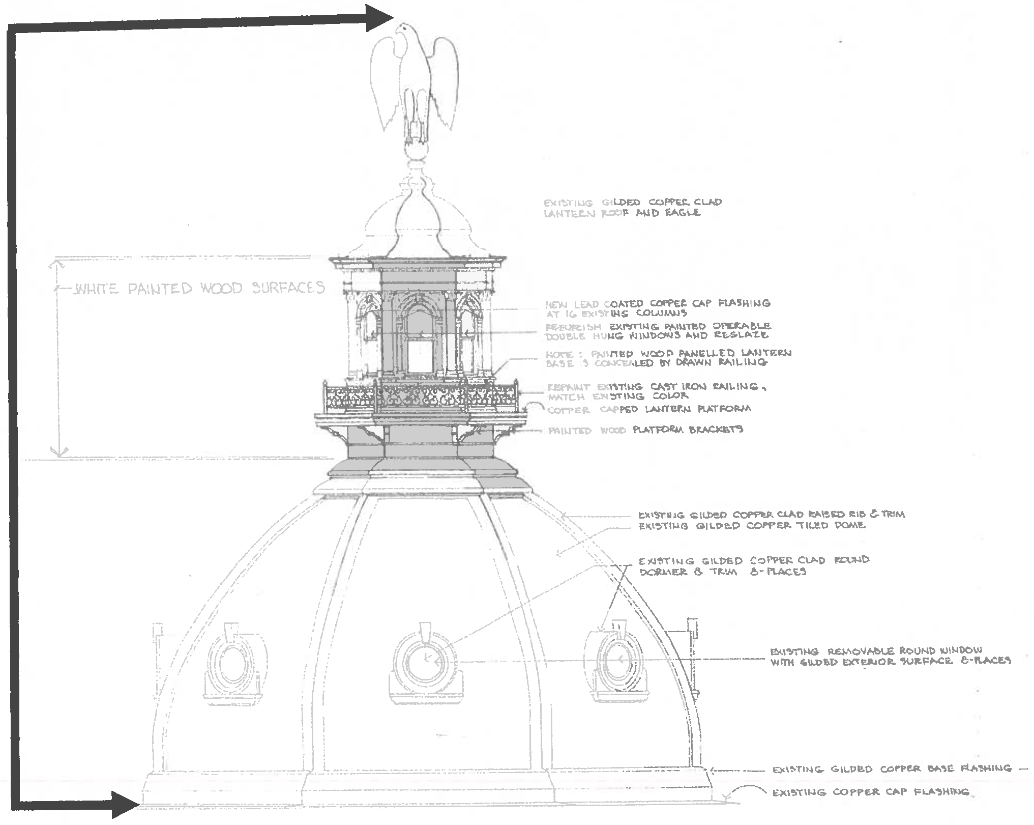 State House Dome. The portion of the State House structure located on top of the drum and encompasses the circular base of the gilded hemispherical structure to the top of the head of the gilded eagle on the lantern roof, as depicted in the graphic below.