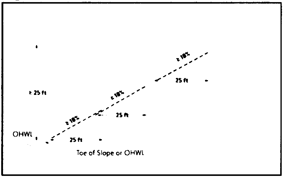 A slope that rises at least 25 feet where the grade of the slope averages 18 percent or greater, measured over any horizontal distance of 25 feet, from the toe of the slope to the top of the slope. Where the slope begins below the ordinary high water level, the ordinary high water level is the toe of the slope. See Figure 1; or