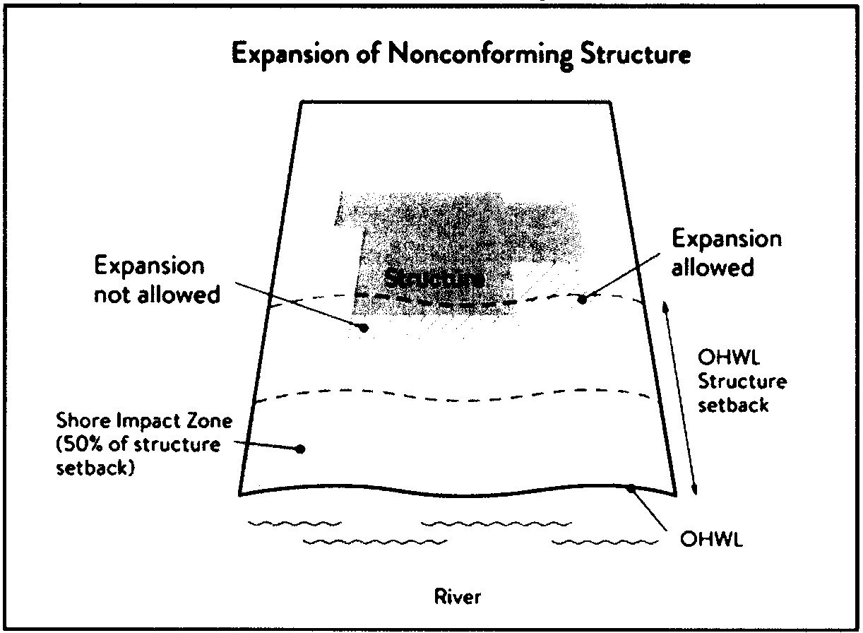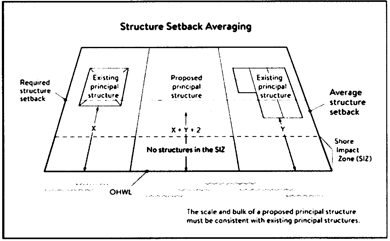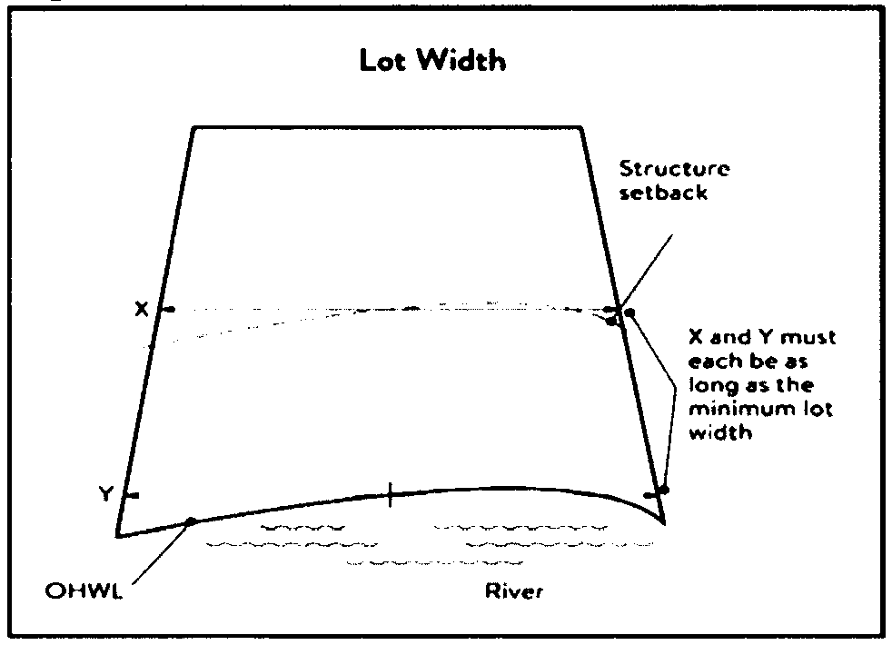 Lot width. The shortest distance between lot lines measured at both the ordinary high water level and at the required structure setback from the ordinary high water level. See Figure 4.