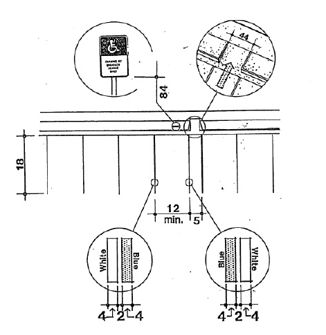 Each such parking space shall be conspicuously outlined in blue paint, and shall be posted and maintained with a permanent, above-grade sign bearing the international symbol of accessibility or the caption "PARKING BY DISABLED PERMIT ONLY," or bearing both such symbol and caption (see Figure 32). Such signs shall not be obscured by a vehicle parked in the space. All handicapped parking spaces must be signed and marked in accordance with the standards adopted by the Department of Transportation.