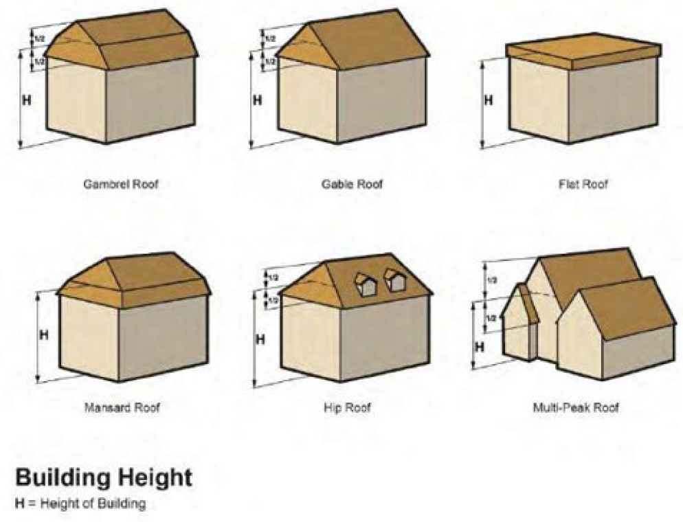 Building Height. "Building height" means a vertical distance measured from the grade plane to the highest point of the roof surface for flat roofs; to the deck line for mansard roofs, and to the average height level between the eaves and ridge for gable, hip, and gambrel roofs.