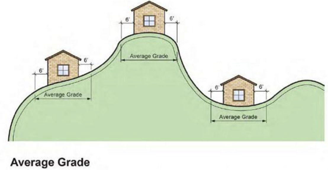 Grade Plane (Average Grade). A reference plane representing the average of finished ground level adjoining the building at exterior walls. Where the finished ground level slopes away from the exterior walls, the reference plane shall be established by the lowest points within the area between the building and the lot line or, where the lot line is more than six feet from the building, between the building and a point six feet from the building.