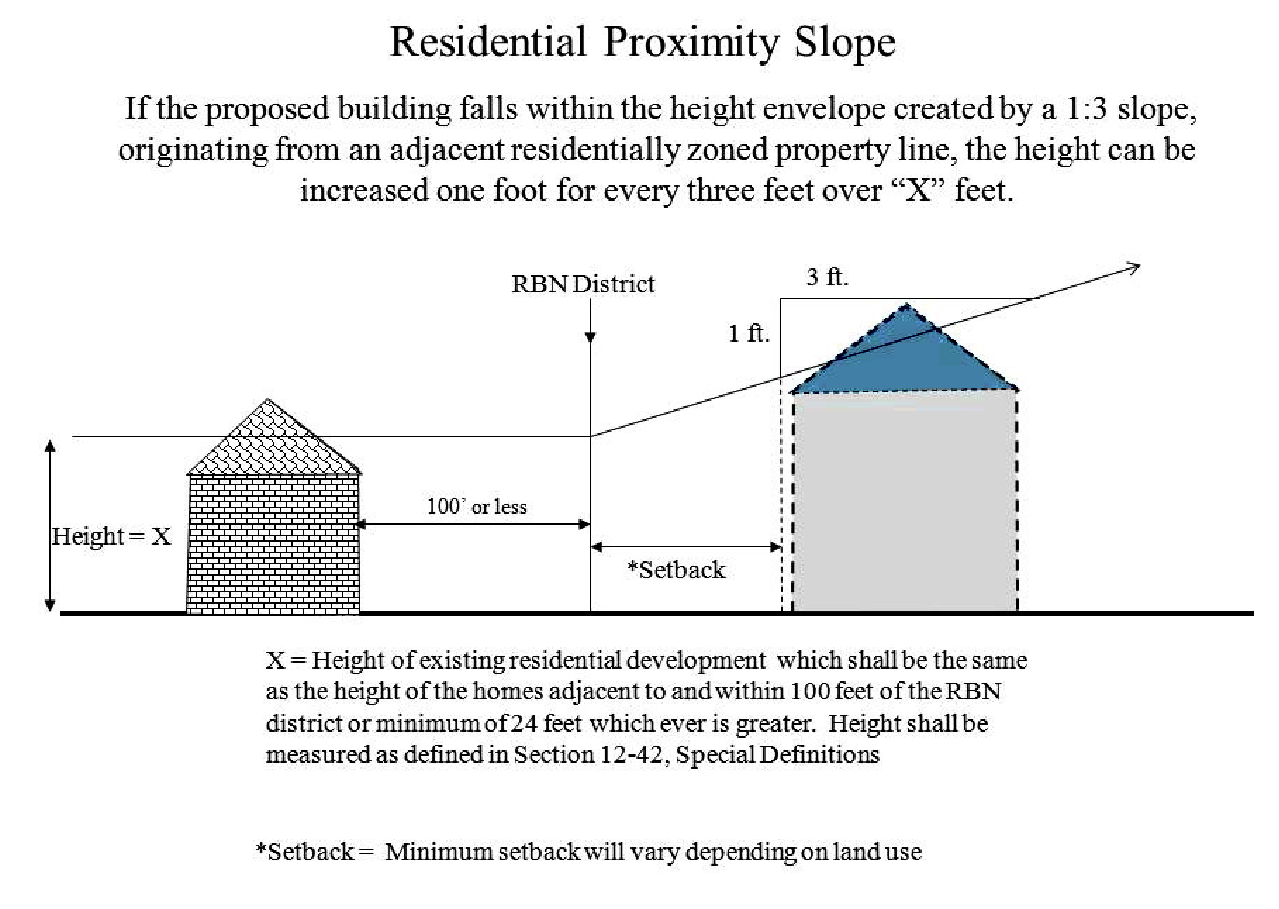 If the proposed building falls within the height envelope created by a 1:3 residential proximity slope originating from an adjacent residentially zoned property line, the height can be increased one foot for every three linear feet over 24 feet.