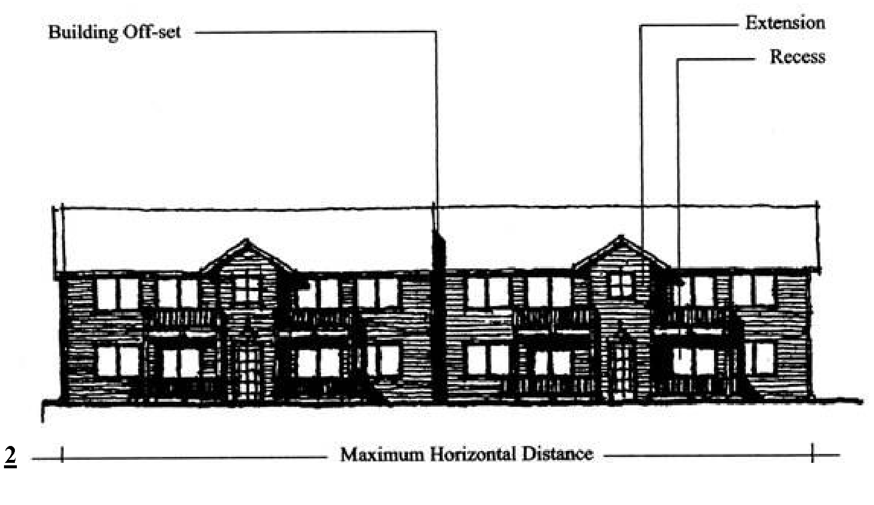 The continuous horizontal distance (i.e., as measured from end-wall to end-wall) of individual buildings shall not exceed 250 feet.