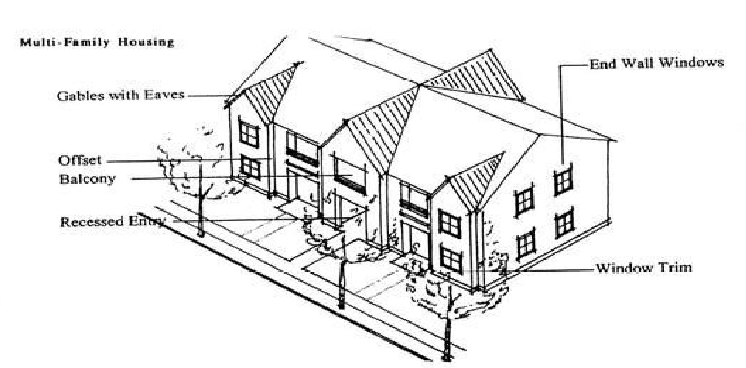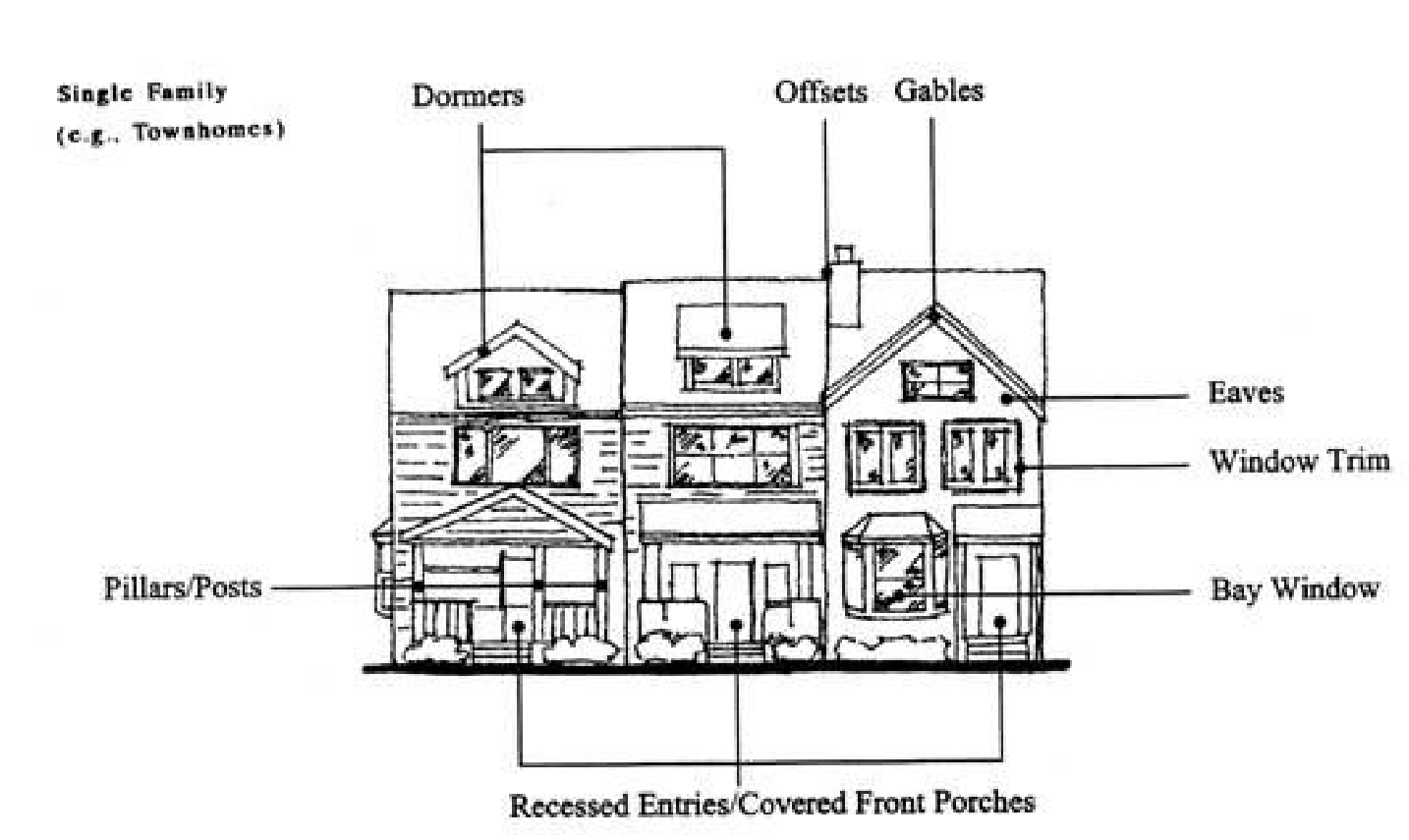 To address the purpose and intent of the objectives of the Coppell 2030 Comprehensive Master Plan, as codified is Chapter 12A, Comprehensive Land Use Plan, of the Code of Ordinances, developments in Urban Residential Neighborhoods should be of an "Architectural character (which) is compatible with the style, proportions, period, materials and colors of adjacent single family neighborhoods, but may vary to a greater degree in proximity to higher intensity development areas". The architectural standards are intended to provide detailed, human-scale design, while affording flexibility to use a variety of building styles. All buildings that are subject to this section shall comply with all of the following standards. The graphics provided with each standard are intended to show examples of how to comply. Other building styles and designs can be used to comply, so long as they are consistent with the text of this section. An architectural feature (i.e., as shown in the graphics) may be used to comply with more than one standard.