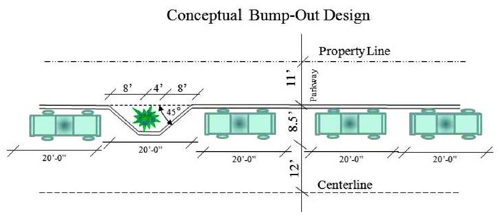 There shall be a maximum of six parallel spaces between bump-outs. Bump-outs shall also be provided at all street intersections where on-street parking is permitted. Additional on-street parking shall not be permitted in close proximity and on the same side of the street.
