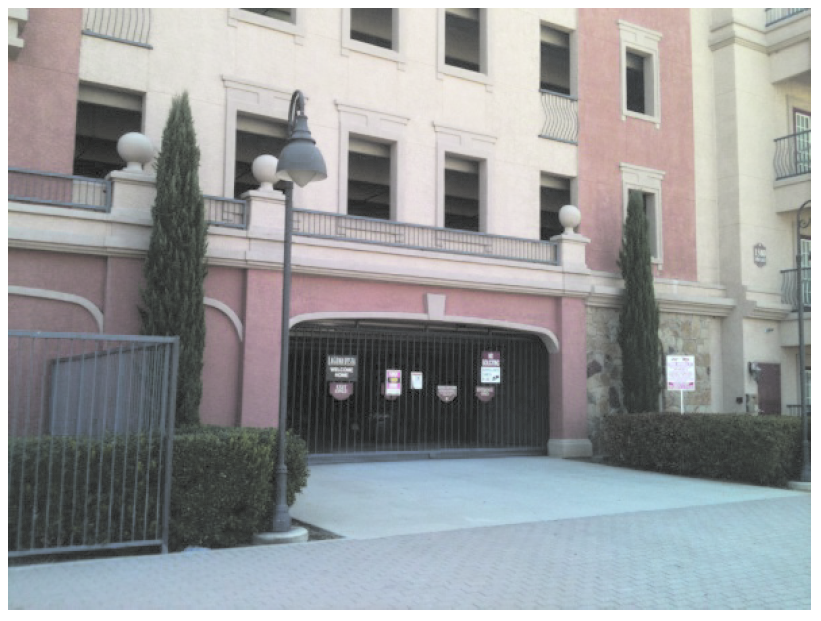Off-street parking, drives (parallel to the street) or other vehicle areas shall not be placed between buildings and streets.