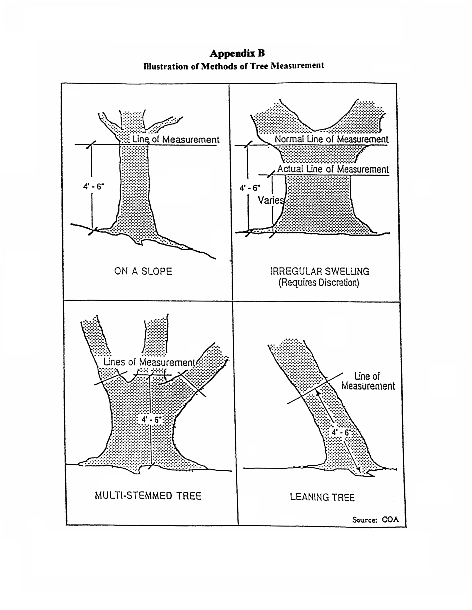 Diameter measurement: The diameter of the protected tree shall be measured as shown. The diameter of a multi-trunk tree shall be determined by adding the total diameter of the largest trunk to one-half the diameter of each additional trunk.