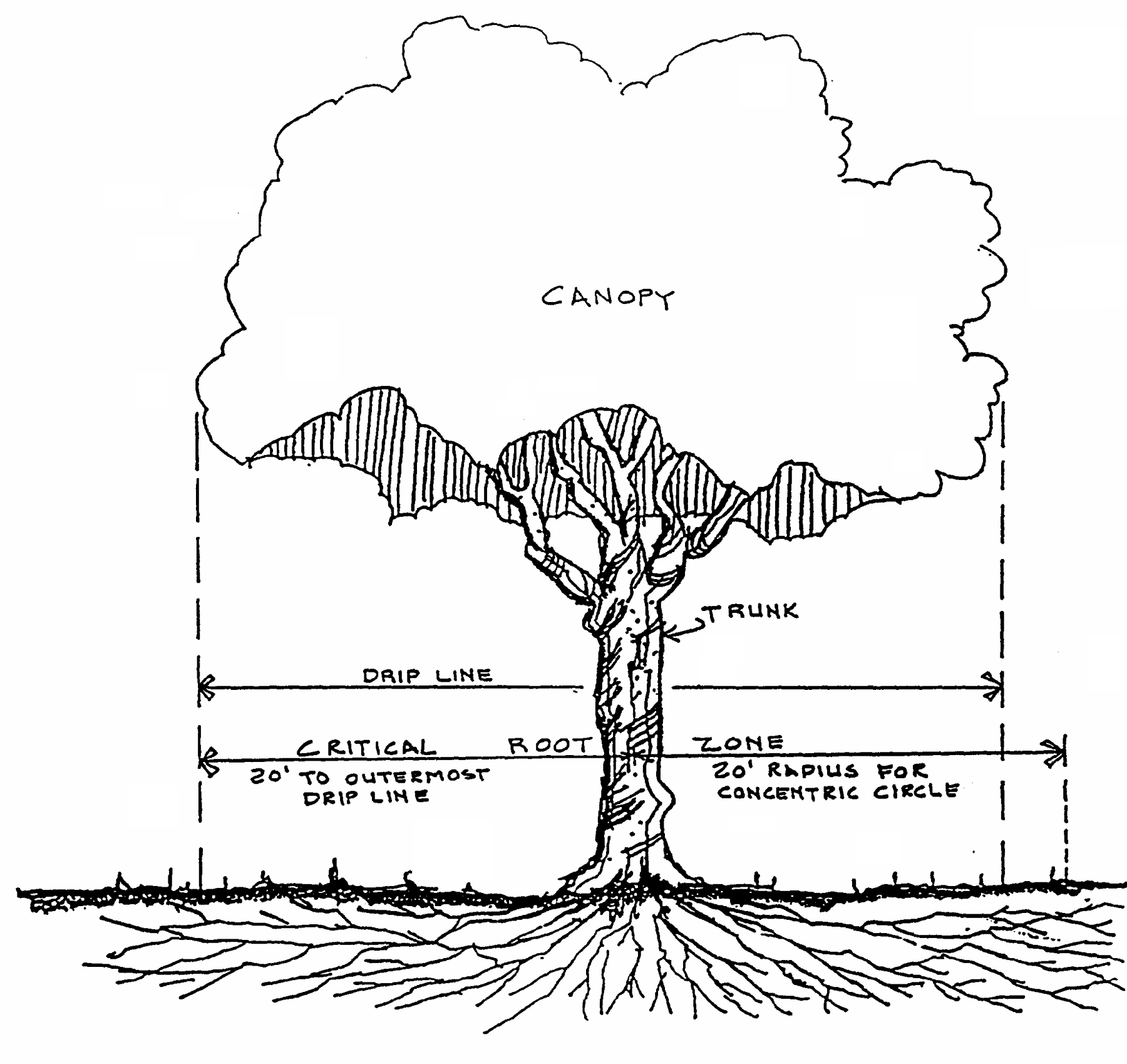 Critical root zone means the top 12 inches of undisturbed natural soil around the tree, defined by a concentric circle with a radius equal to the distance from the trunk to the outermost portion of the drip line, wherein roots critical to its survival are growing.