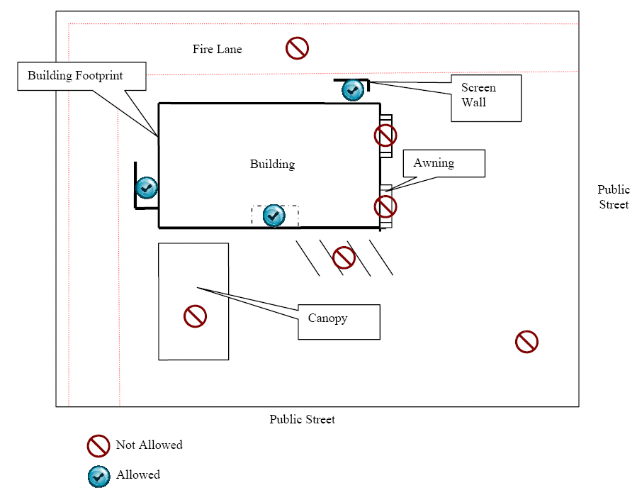 Screened from view from an adjacent public street: A permanent structure of sufficient height to screen material and which in no event extends higher than the exterior wall of the primary building and constructed of the same or similar color and material as the primary building.