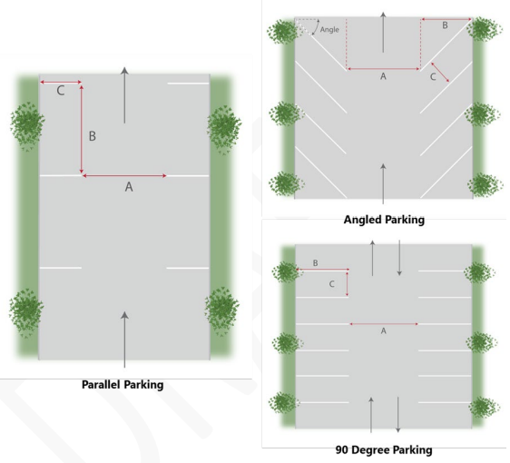 | Angle (Xº) | Aisle Width (A) | Stall Depth (B) | Stall Width (C) |