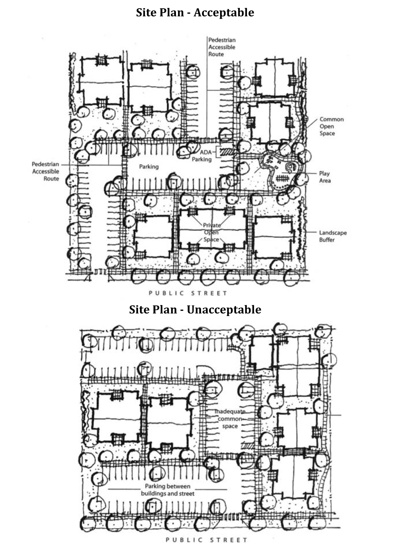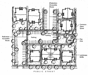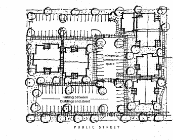 Where a site contains multiple buildings and there is insufficient street frontage to which buildings can be oriented, a primary entrance may be oriented to common green, open space, plaza, or courtyard (e.g., cottage cluster). When oriented in this way, the primary entrance(s) and green, plaza, or courtyard shall be connected to the street by a pedestrian walkway meeting the standards in Section 17.60.030. See example in Figure 17.24.090(C)(1), "Site Plan—Acceptable."