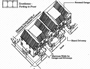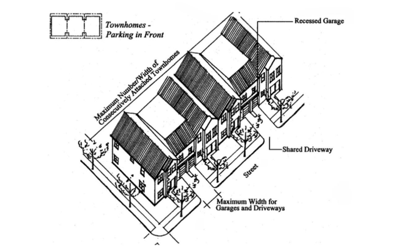 The maximum number of consecutively attached townhouses with garages facing the same street is four (two driveways); and