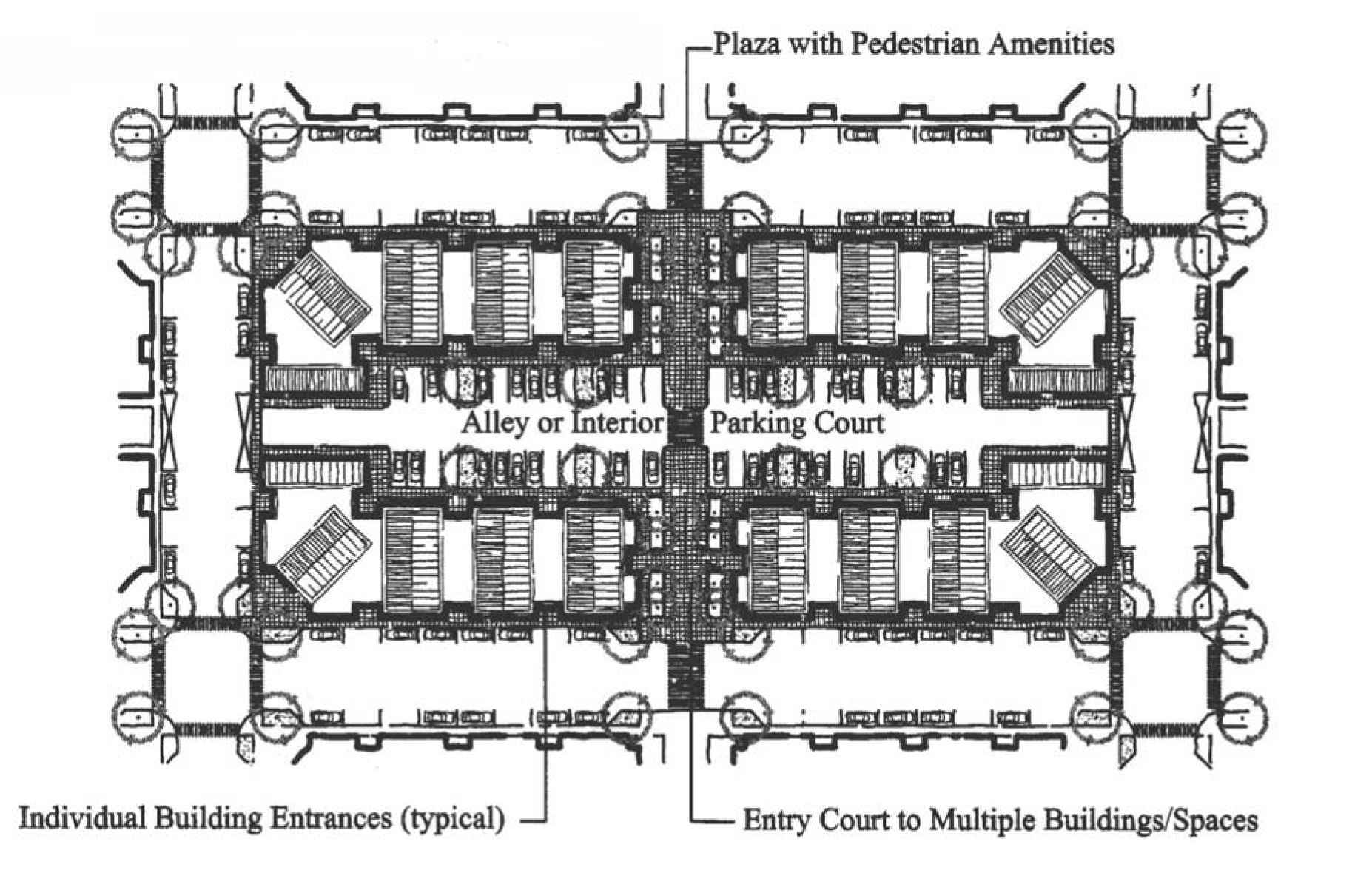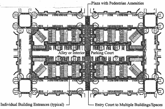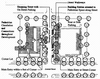 The site shall be configured into blocks that have frontage onto streets, interior parking courts (as generally shown in Figure 17.55.100(D)(2), above), or "shopping streets" (as generally shown in Figure 17.55.100(E), below). All shopping streets shall contain on-street parking (parallel or angled parking), sidewalks, street trees, and pedestrian lighting; and all buildings shall orient their primary entrances to a street, plaza or courtyard. Additionally, buildings placed at a street/block corner shall have a primary entrance within twenty (20) feet of the street/block corner.