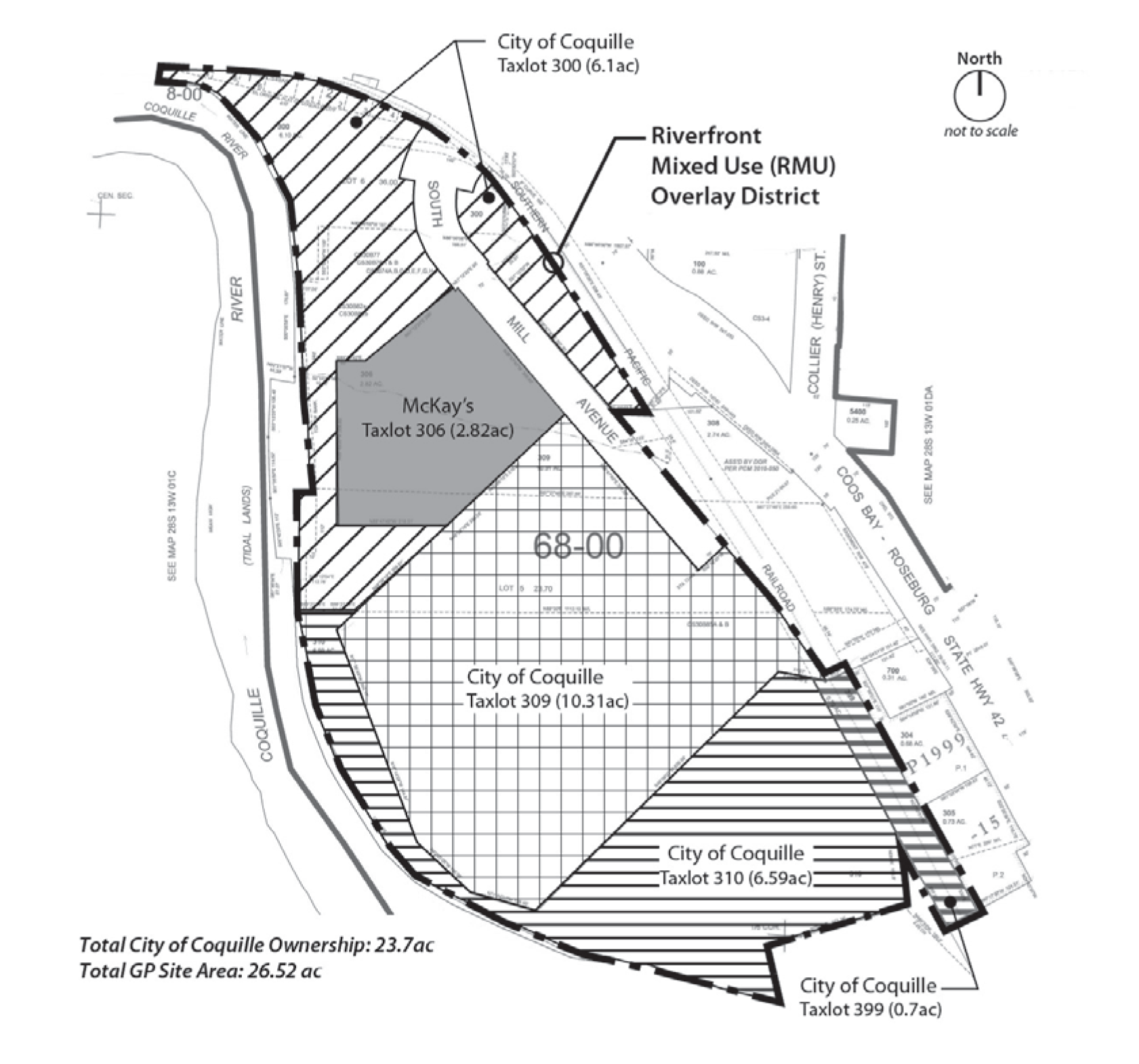 District Stormwater Filtration and Retention Facility. The city of Coquille plans to construct an engineered stormwater biofiltration swale and linear retention facility along the river frontage of the riverfront mixed use overlay district. In addition to protecting the Coquille River from increased stormwater discharges, the bioswale/retention basin will allow for individual developments in the RMU overlay district to avoid on-site impoundment by directing runoff to that structure, even if still required to implement approved stormwater treatment methods.