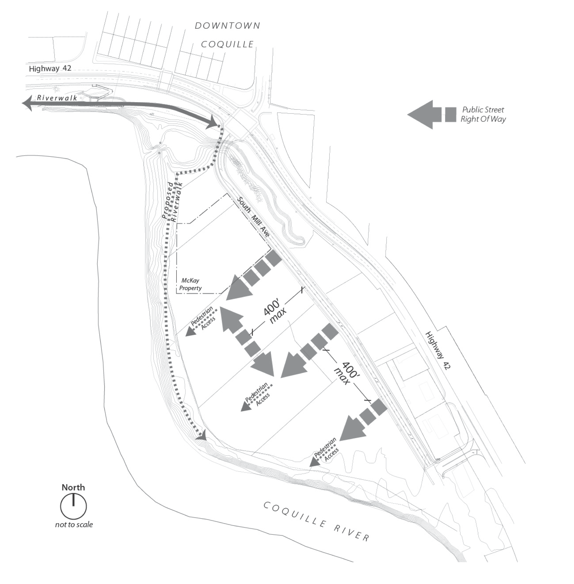 Where applicable, subdivisions and site developments shall be designed to provide public pedestrian access to the Riverwalk at a maximum spacing of four hundred (400) feet, as measured along the Riverwalk (as generally shown in Figure 17.55.100(F)). Public pedestrian access shall be provided either through public streets or public pedestrian easements. Pedestrian easements shall have a minimum width of fifteen (15) feet. Paved walkways with a minimum width of ten (10) feet shall be provided in pedestrian easements. The extent of pedestrian walkway each development is required to construct will be determined by the reviewing authority.