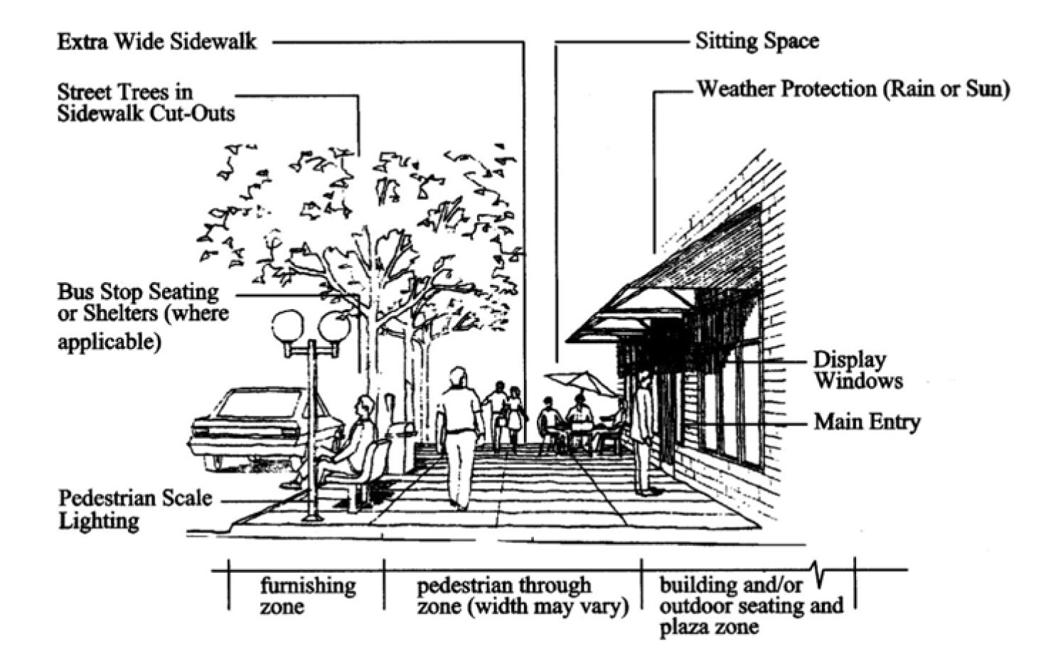 Standards. Developments in the mixed use overlay district shall provide at least one pedestrian amenity, as described below and as generally illustrated in Figure 17.55.130(B). Pedestrian amenities may be provided within a street furnishing zone, building frontage zone, or plaza, or within the pedestrian through zone, as shown in Figure 17.55.130(B), and shall be physically accessible to the public. Use of the public right-of-way requires approval by the road authority. Design standards for pedestrian amenities follow: