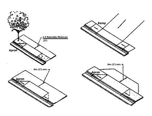 Driveway Construction. Driveway aprons (when required) shall be constructed of concrete and shall be installed between the street right-of-way and the private drive, as shown in Figure 17.60.020(K). Driveway aprons shall conform to Americans With Disability Act requirements for sidewalks and walkways, which generally require a continuous unobstructed route of travel that is not less than three feet in width, with a cross slope not exceeding two percent, and providing for landing areas and ramps at intersections.