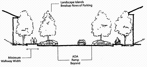 Parking areas containing twenty-four (24) or more parking spaces shall be broken up so that parking bays do not exceed twelve (12) contiguous parking spaces without a break. Parking areas may be broken up with landscape islands of not less than four feet in width and six feet in length, handicap-accessible walkways, plazas, large landscape areas (e.g., parking lot or site perimeter landscape buffers, or landscape areas intended to protect significant trees), streets, or driveways with street-like features. Street-like features, for the purpose of this section, means a raised sidewalk that is at least four feet wide for residential projects and at least six feet wide in all other projects, with six-inch raised curbs, accessible curb ramps, street trees in planter strips or tree wells, and pedestrian-oriented lighting.