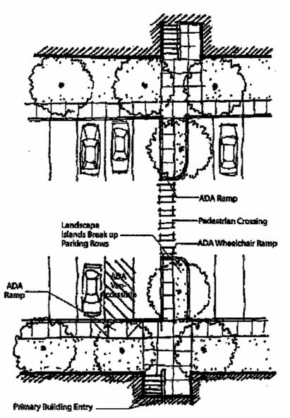Accessible Routes. Walkways shall comply with applicable Americans with Disabilities Act (ADA) requirements. The ends of all raised walkways, where the walkway intersects a driveway or street shall provide ramps that are ADA accessible, and walkways shall provide direct routes to primary building entrances.