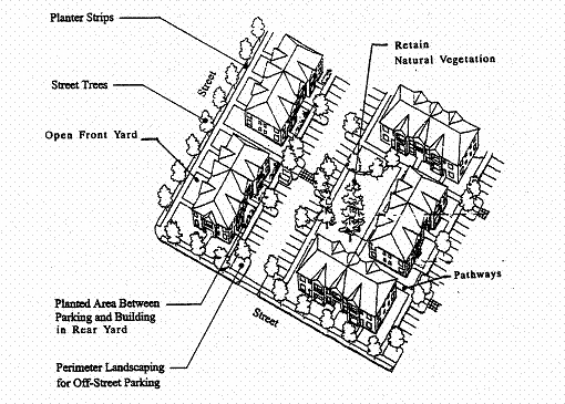 Section 17.64.030, Landscaping, sets standards for and requires landscaping of all development sites that require site design review. This section also requires buffering for parking and vehicle maneuvering areas, and in some instances between different land uses. Section 17.64.030 is to be applied in conjunction with Division II, Land Use Districts.