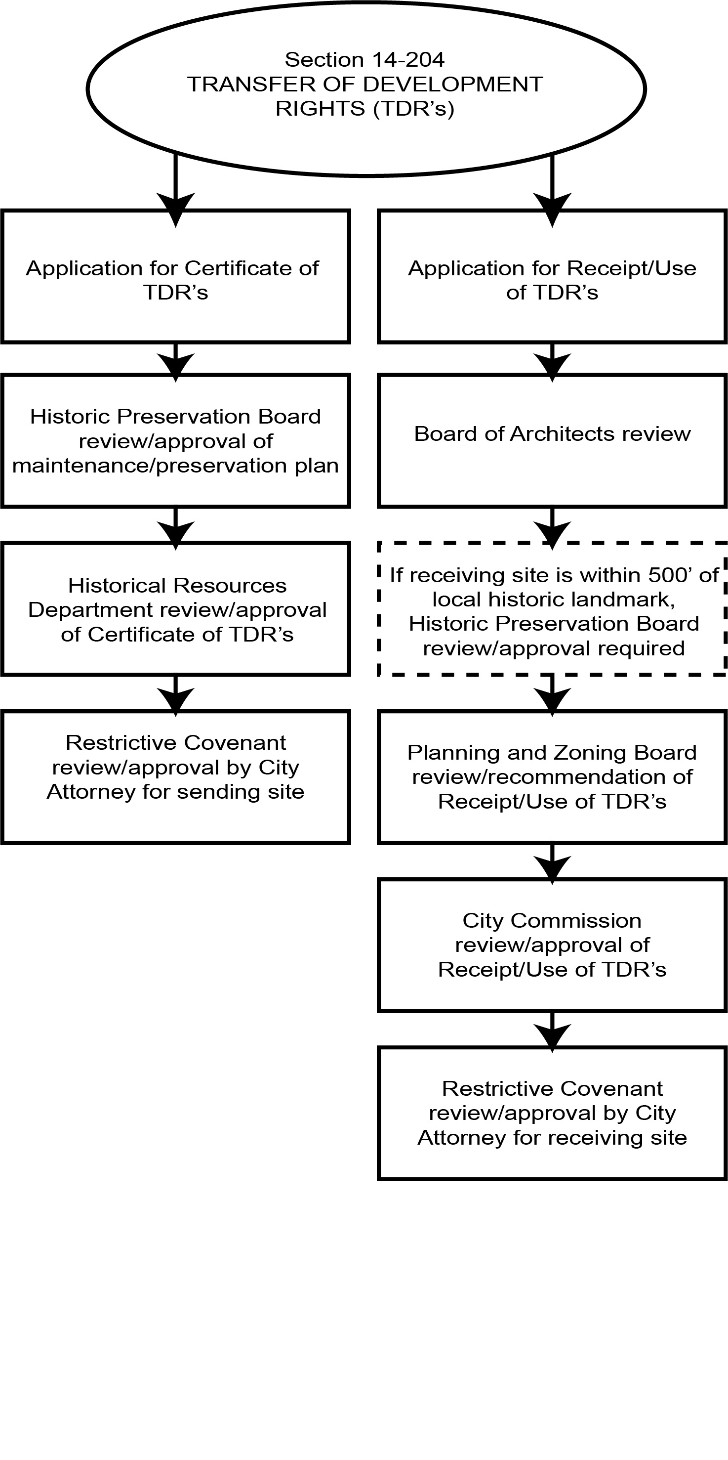 The following graphic summarizes the review and approval procedures for the Transfer of Development Rights (TDRs).