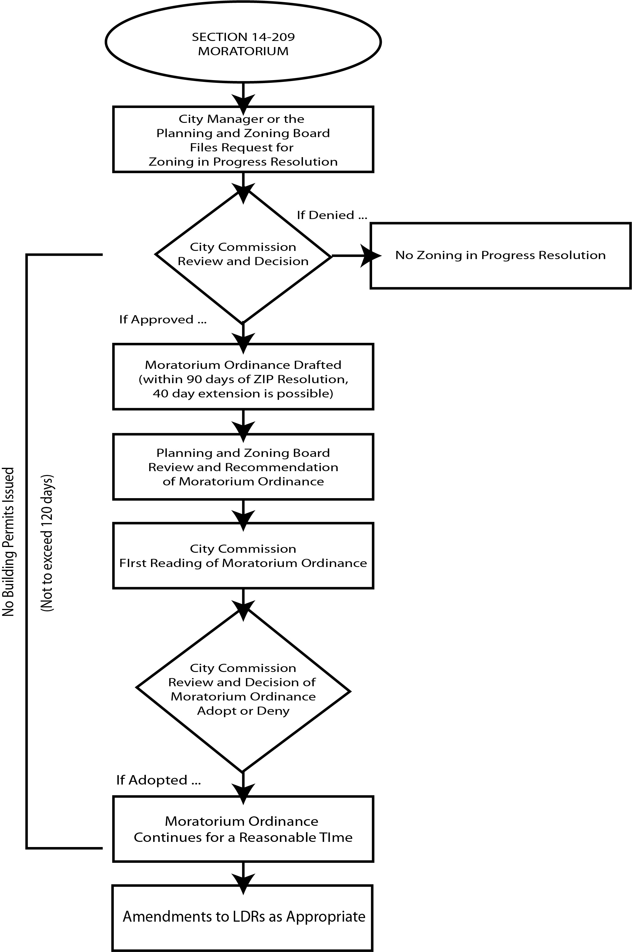 The City Manager or the Planning and Zoning Board may file a request with the City Commission for a Zoning in Progress Resolution. The request shall be made in writing and shall be accompanied by a City staff report summarizing the need for a revision to these regulations and the area or areas within the City that will be affected. Such report shall contain a determination concluding the need for a resolution of the City Commission declaring Zoning in Progress and for the adoption of a formal moratorium. The City Commission may consider a Zoning in Progress Resolution on its own initiative.