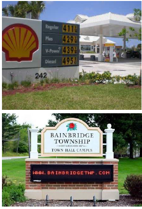 Lighting: External lighting fixtures designed to complement the appearance of the sign or internal lighting that only illuminates text and logos.