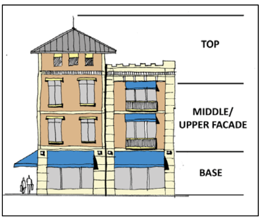 Street facing building facades shall be designed with identifiable first floor, upper façade and top/rooflines.