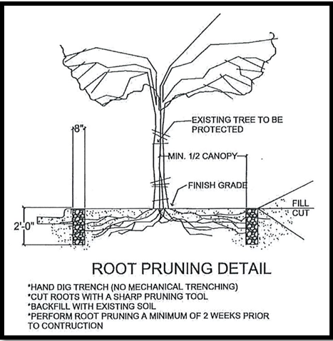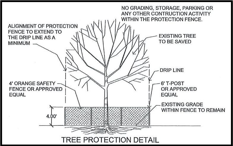 Pavement shall not be placed closer than five (5) feet from the trunk of a new tree unless a City approved root barrier is utilized. Existing trees shall be protected with an area equal to the area encompassed by drip lines.