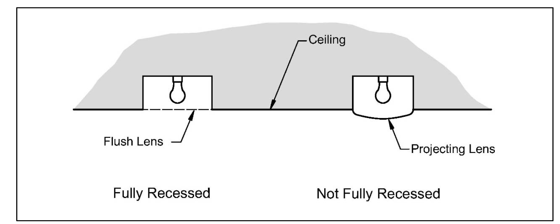 Fully recessed lights in ceilings of canopies or roof overhangs may be of any type provided the level of illumination does not exceed the limitations specified in 2.09.07. G. See Figure 14: Ceiling Light in Canopy or Overhang (below).