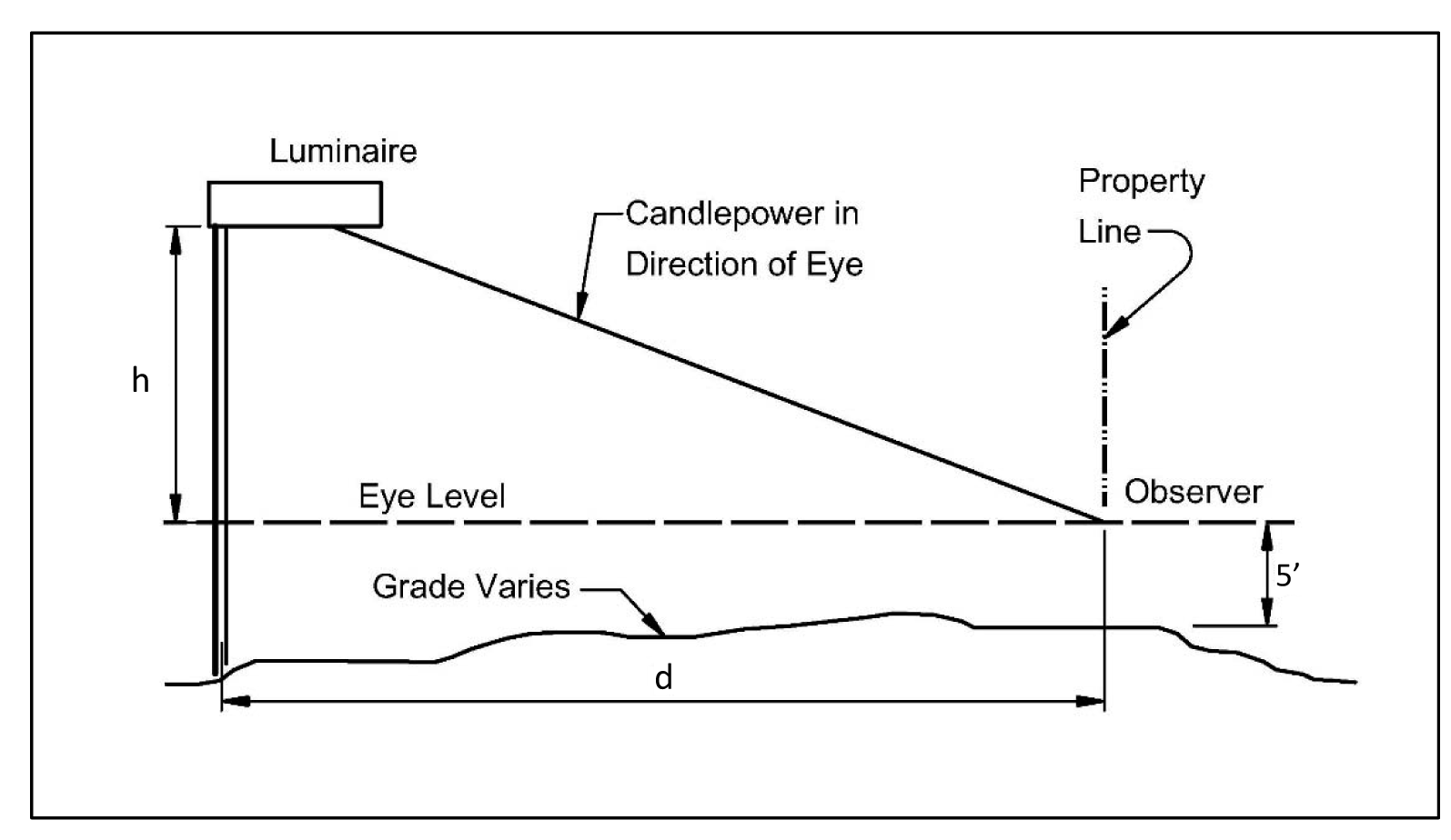 Luminaries shall be aimed in such a manner that the viewer's eye, five feet above ground at or beyond the property line, shall not be exposed to fixture Luminance within the floodlight beam of the luminaries.