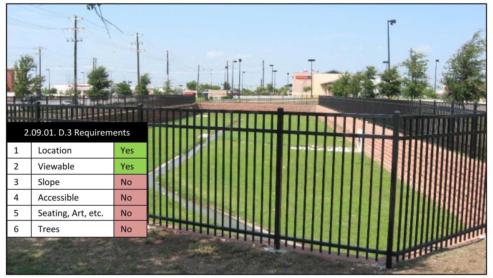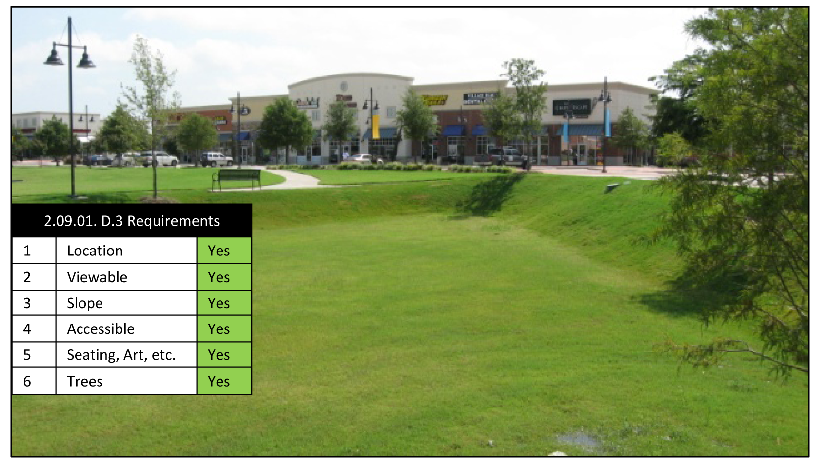One shade tree (3 inch caliper minimum) (per Table 15: Recommended Plant Material List) shall be provided for each 50 feet of street frontage within the landscape edge between the below grade open parking and the street Right-of-Way.
