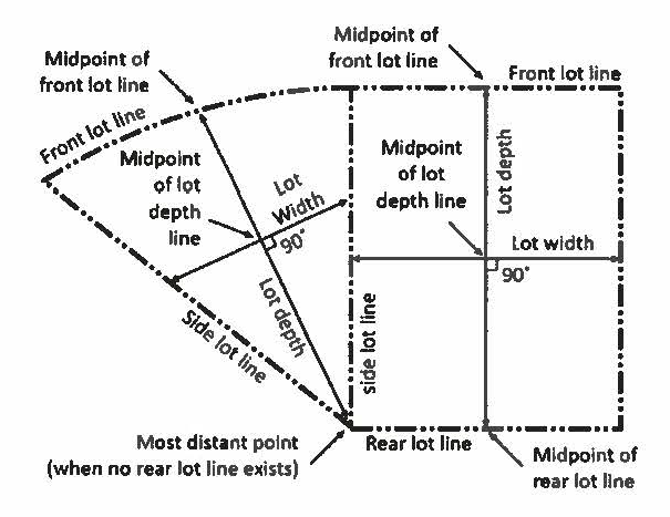 The horizontal distance between the side lot lines, measured at right angles to the lot depth at a point midway between the front and rear lot lines. Figure 17.2 above illustrates the method used to determine lot width.