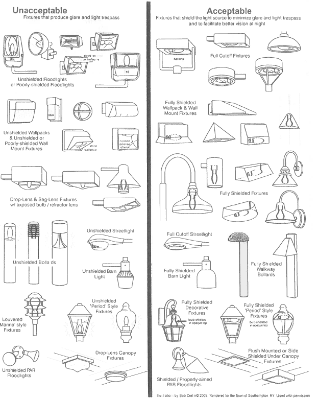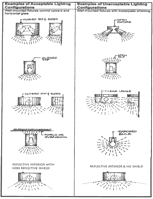 General Standard: All light fixtures, including security lighting, shall be located, aimed and shielded so that the direct illumination from the fixture shall be confined to the property boundaries of the source. Shields shall be constructed of material which is primarily non-reflective, non-specular, and opaque in nature. A light fixture shall be determined to be non-compliant if the interior of the shield directly reflects light in a manner which causes nuisance glare which exceeds the UGR Maximum Rating Value, or light trespass. To be considered shielded, fixtures must be closed on top and mounted such so that fixture does not allow light trespass or nuisance glare. Examples of acceptable and unacceptable light shielding and hooding are shown on the following pages.