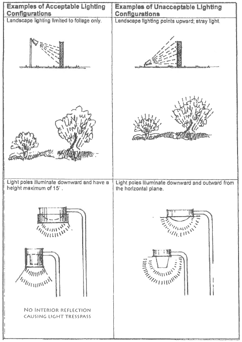 Accent or landscape lighting shall be directed onto foliage or objects and not skyward or onto adjacent properties. Direct light emissions shall not be visible above the roofline or beyond the building edge.