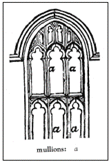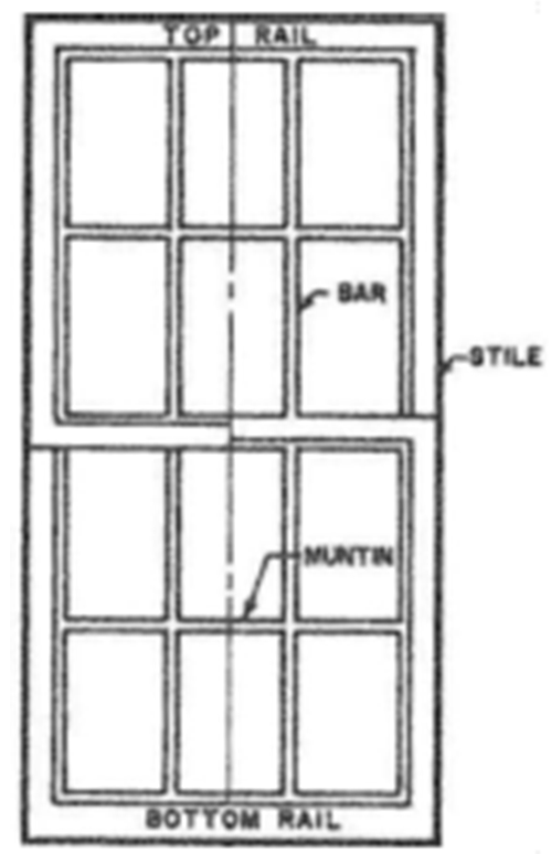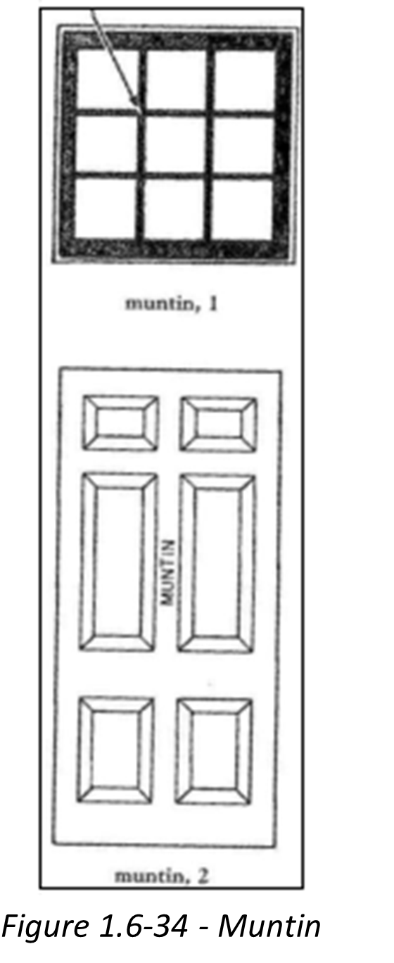 Muntin, Window—A secondary framing member to hold panes within a window, window wall or glazed door, as shown in Figure 1.6-34. [1]