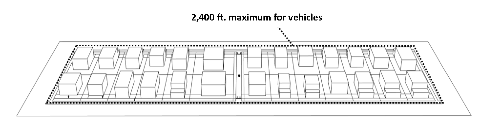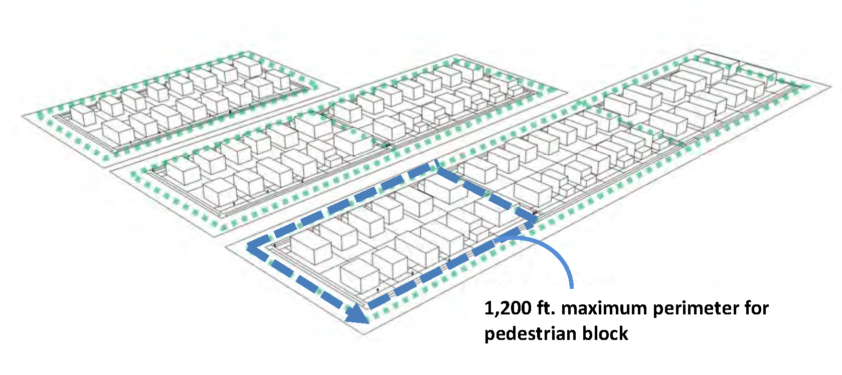 Maximum pedestrian block perimeter: 1,200 feet as measured along the centerlines of the sidewalks or multiuse paths that form the block.