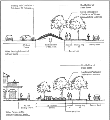 Landscape planters between the sidewalk and edge of the public access easement, located on both sides of the sidewalk, and extending the length of the corridor. The applicant must provide vegetative or non-vegetative groundcover within the landscape planter consistent with Section 4.2.20.a.3, and irrigation to ensure plant survival.